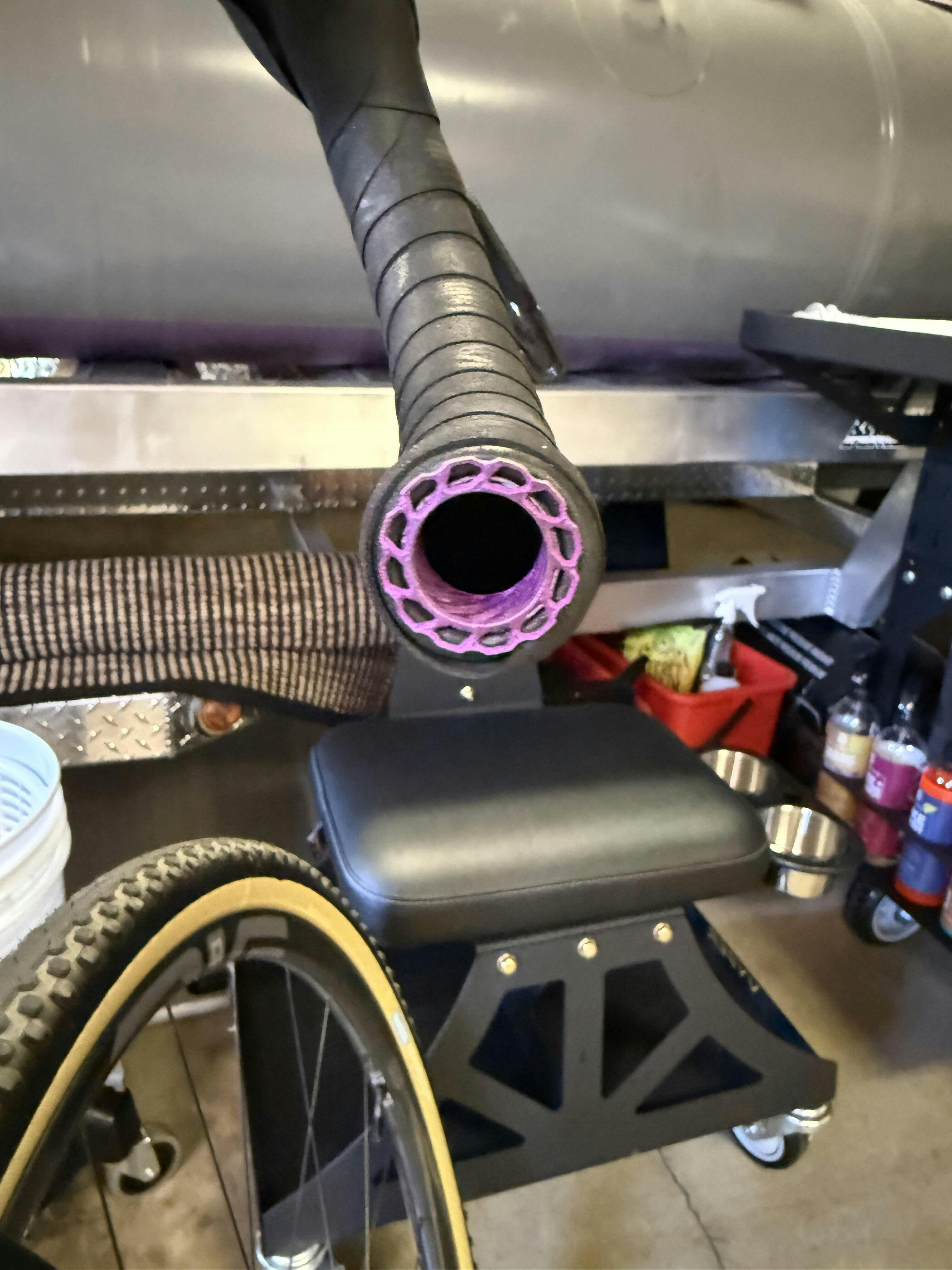I ride a custom BinghamBuilt titanium gravel bike, and I am immersed in a weight-saving project. The Enve G23 wheels were swapped for Light Bicycle AR25's and Extralight Cyber hubs, the Enve Aero bar and stem became a Darimo Nexum bar-stem combo, etc. I have picked most of the low-hanging fruit and I'm now hunting marginal gains. One of my recent discoveries was the Superlight Titanium Bar End Plug at only 2.5g! I immediately ordered a purple pair and they are beautiful! Just a small layer of Gorilla Tape and they snugged right in. To my surprise the old plugs weighed 14g each! Not a lot of gain you might say, but every gram translates into better climbing ability, and now the 18 1/2 lb bike is only 16 1/2!
